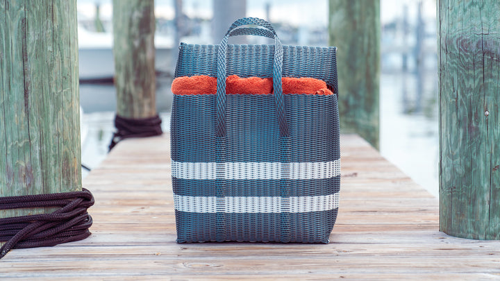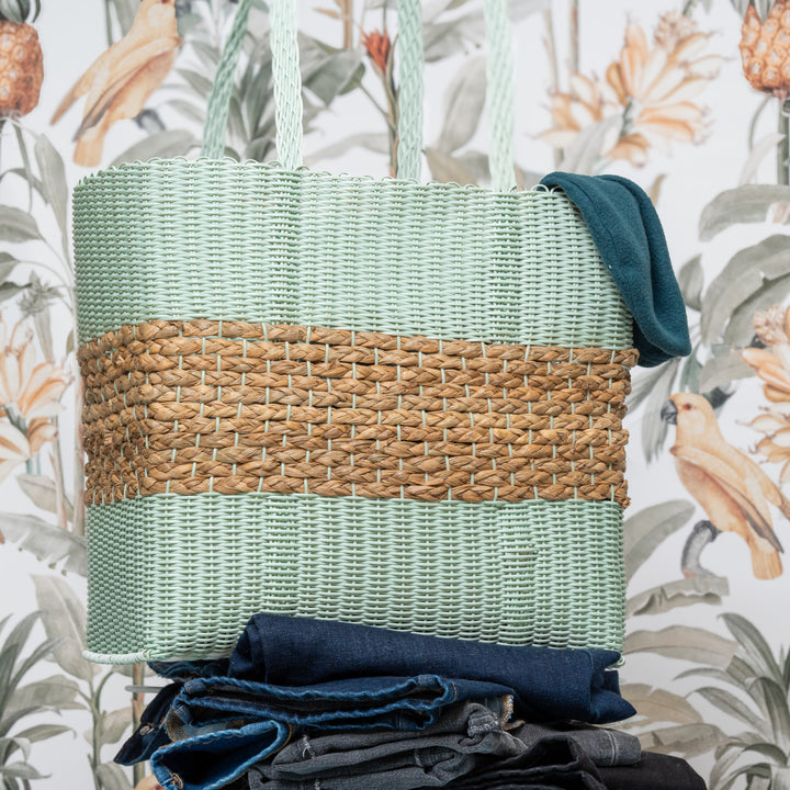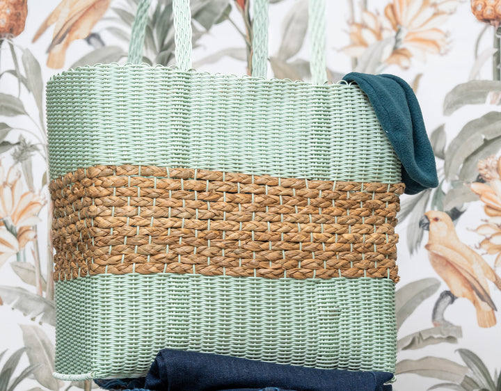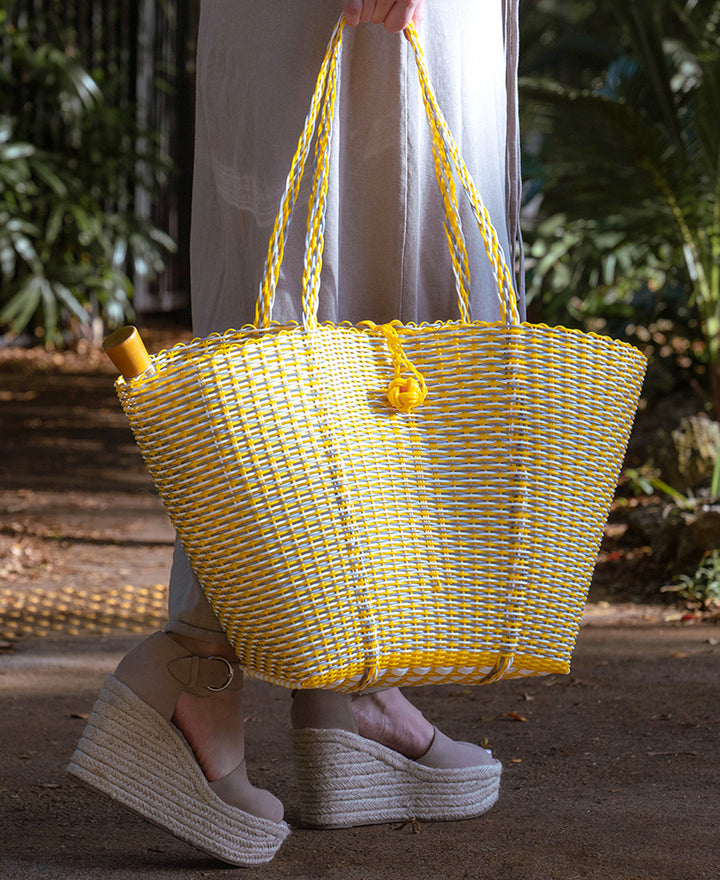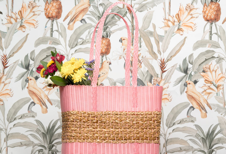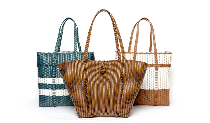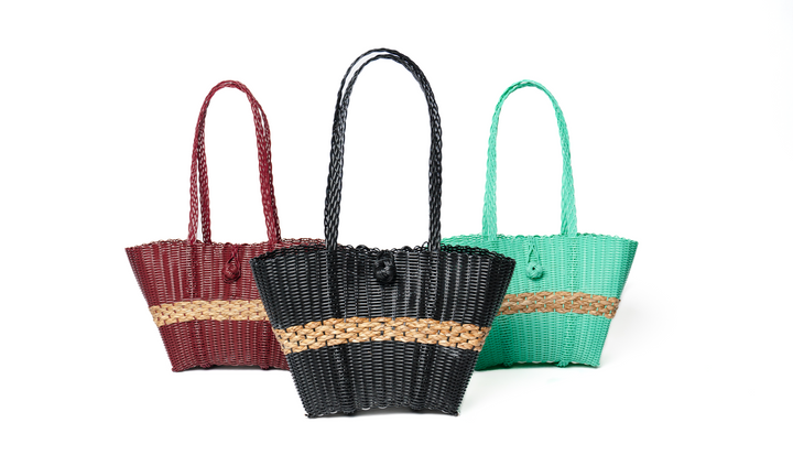 Woven plastic bags are a part of the Salvadoran culture for decades. Women and men design these artisan handbags for practicality. In El Salvador, these plastic woven totes are used as beach bags, reusable grocery bags, and for daily use because of their durability.